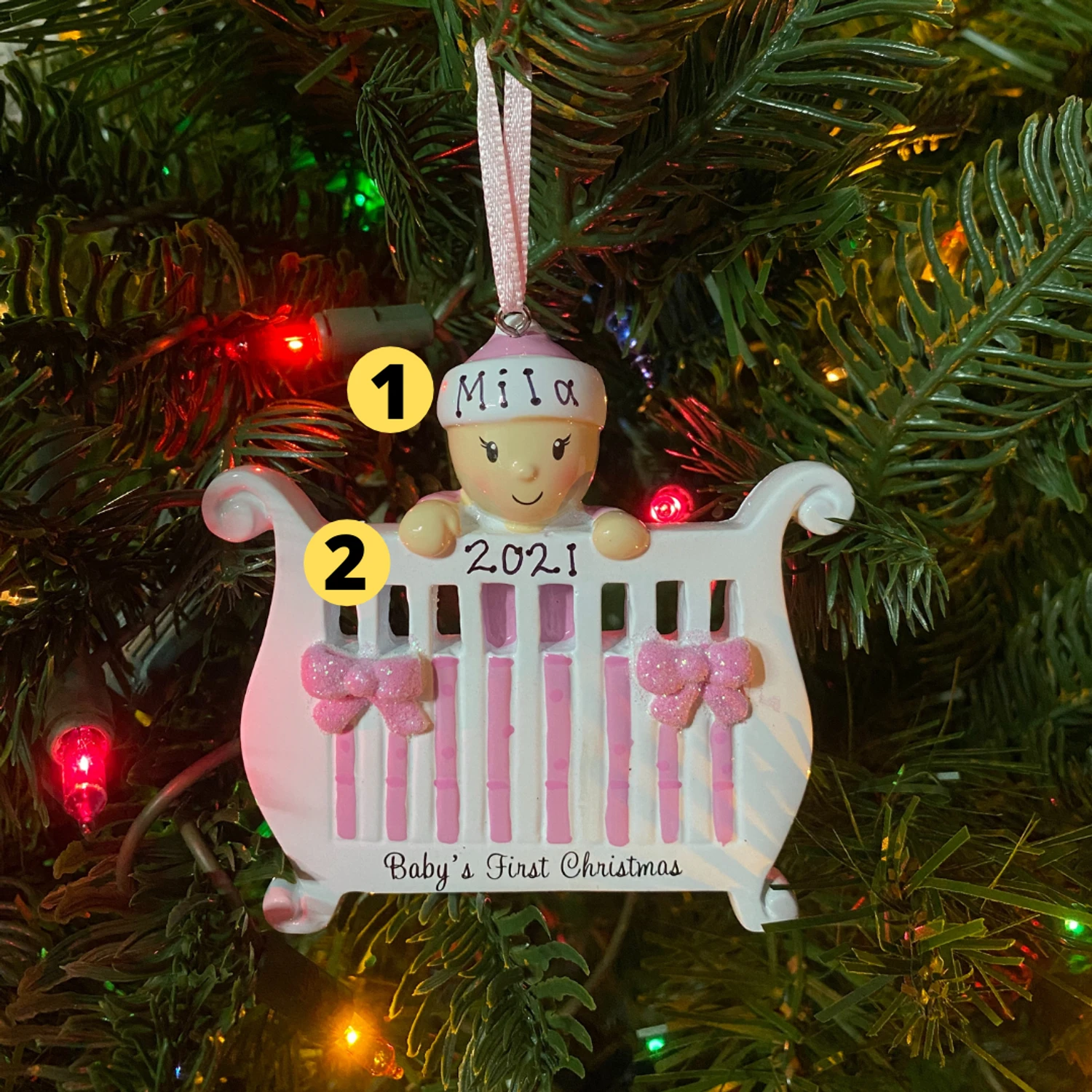 Welcome the newest member of the family this Christmas with this ornament! It features a white crib with a pink crib liner and pink bows with a smiling baby popping over the top! Get your baby’s name written on the baby’s hat and the year on the crib! Made of resin. Dimensions: 3.5″ x 3.5″. Item #: OR1732-P