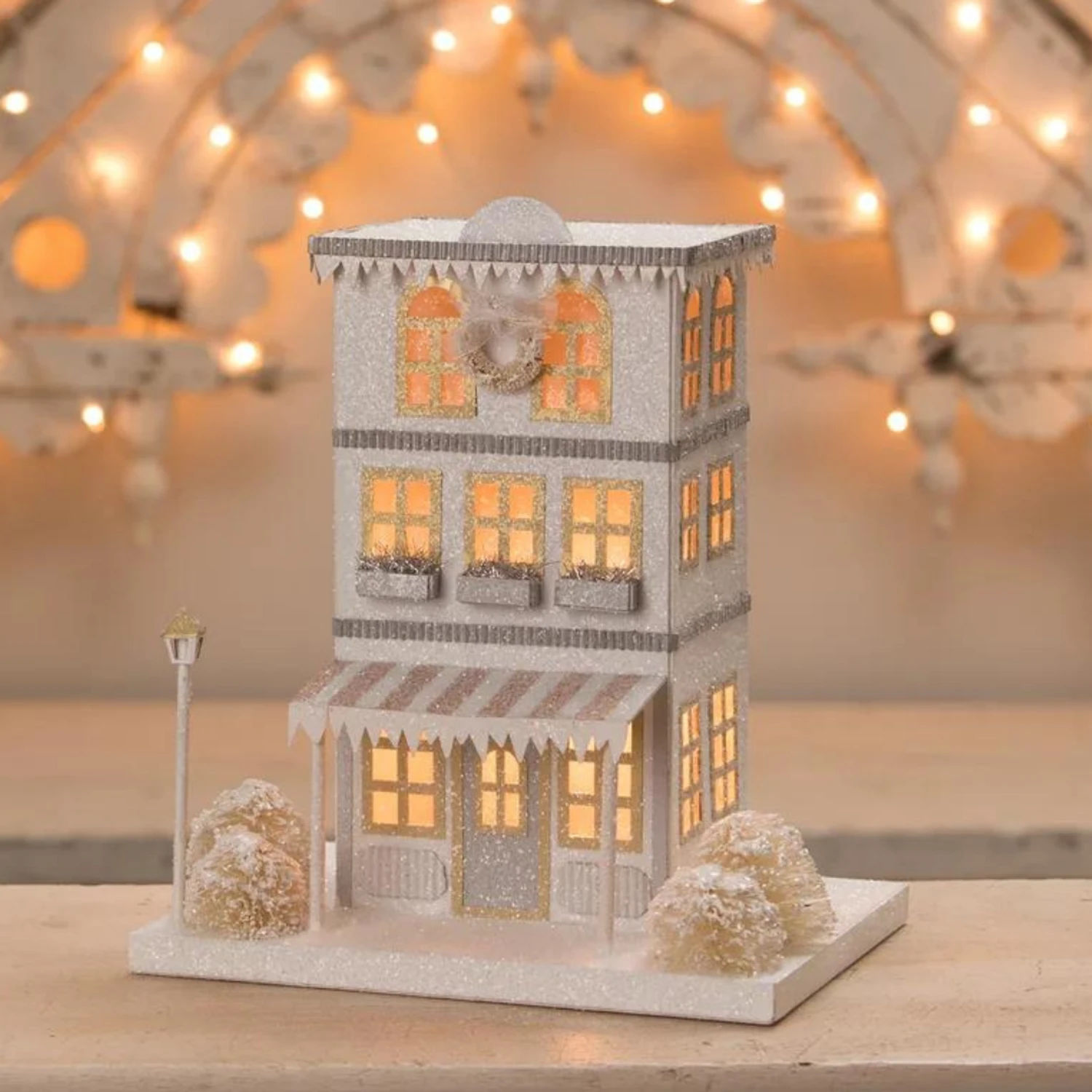 Make a statement on your mantle this holiday with these stunning Christmas buildings! Each one is covered in white glitter with silver and gold glitters accents and decorated with bottle brush trees and wreaths with tiny bows! Choose between a spectacular storefront shoppe, a terrific townhouse, a cute church, or a cozy cottage home! Light up the buildings with a C7 light cord. Light cord is NOT INCLUDED. Made by Bethany Lowe. Dimensions: Storefront Shoppe LC1565- 11″ x 8″ x 13″, Townhouse LC1566- 11″ x 8″ x 14″, Church LC1564- 11.25″ x 8″ x 16″, and Cottage Home LC1567- 11″ x 8″ x 13″. Made of pressed paper, bottle brush, glitter, and fabric trims. Item #: LC1565, LC1566, LC1564, and LC1567. Each item sold individually.