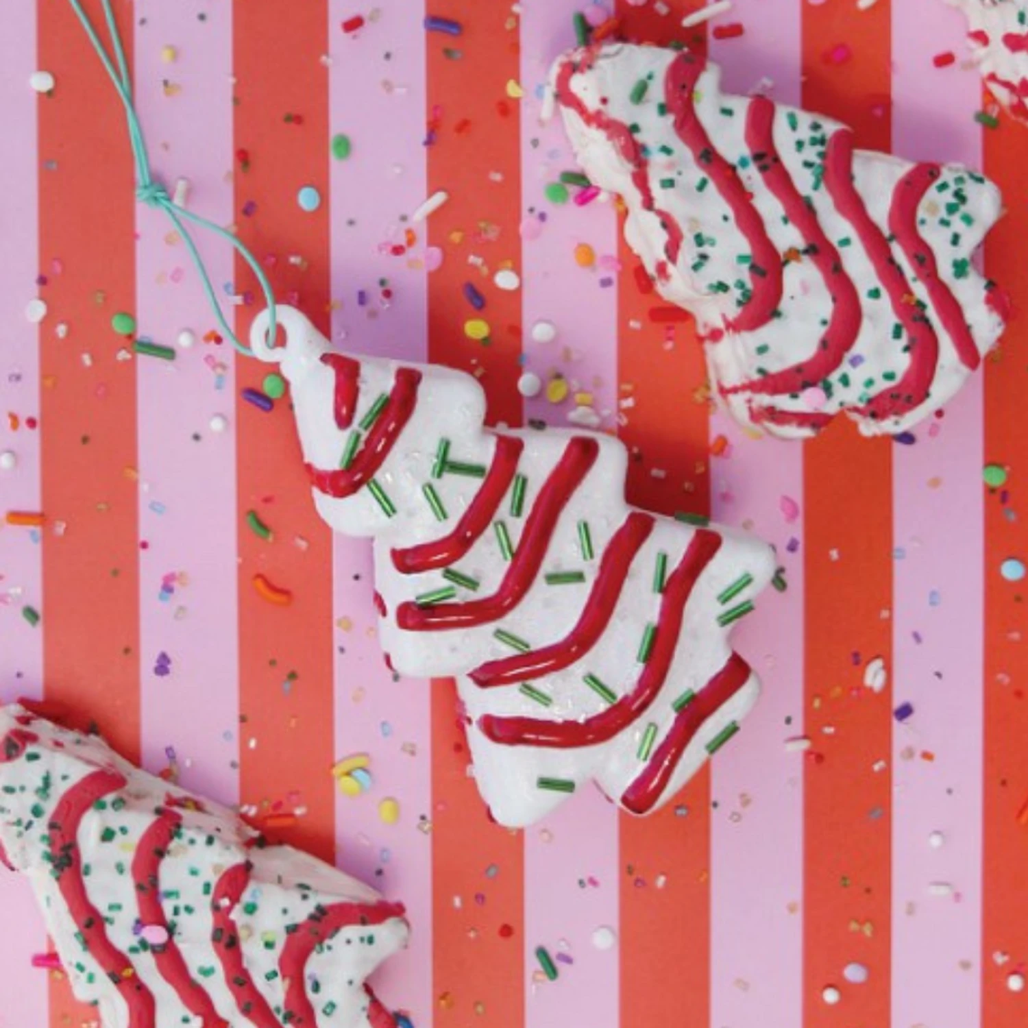 Betcha can’t eat just one! We know we cant! This ornament features a dessert everyone can’t keep their paws off- the little debbie Christmas tree cake! The ornament is a bright white tree with red icing drizzle and green sprinkles! Perfect for those with a sweet tooth! Sold individually. Made by Cody Foster. Made of glass. Dimensions: 4.5″ tall. Item #: GO-8388