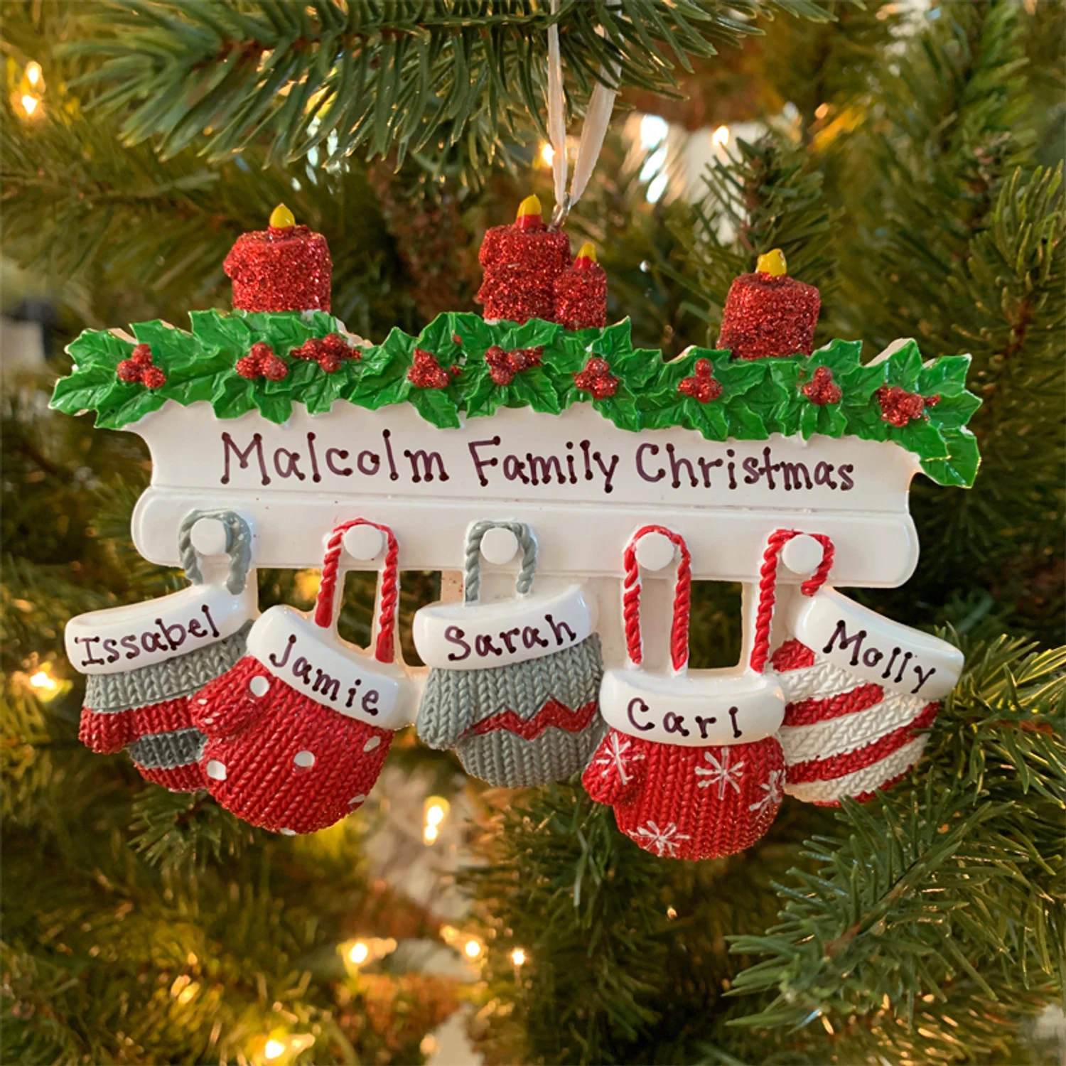 Colorful mittens hang merrily from their hooks in the front hall after a fun day of sledding, snowball fights and snowman building. The shelf above them is decorated with glowing candles and holly garland. Lend this pretty scene to your tree personalized with your family names. Made of resin. Dimensions 5 x 3 1/2 x 1/2. Item KA968-5. No additional charge for personalization.