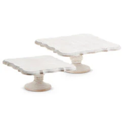 This stunning cake stand features a beautiful star made up of white beads, gold fabric folds, gold embroidery, and jewels. In between each point of the large star, small stars shoot out! The top of the stand has a gorgeous glittering star with each point tipped with tiny stars! The plate on top and the plate on the bottom each have intricate filigree molding. Display your cupcakes and cakes in style! Made by Katherine’s Collection. Made of resin, paper mache, and fabric. Dimensions: 10.75 × 10.75 × 10 in. Item #: 28-328020