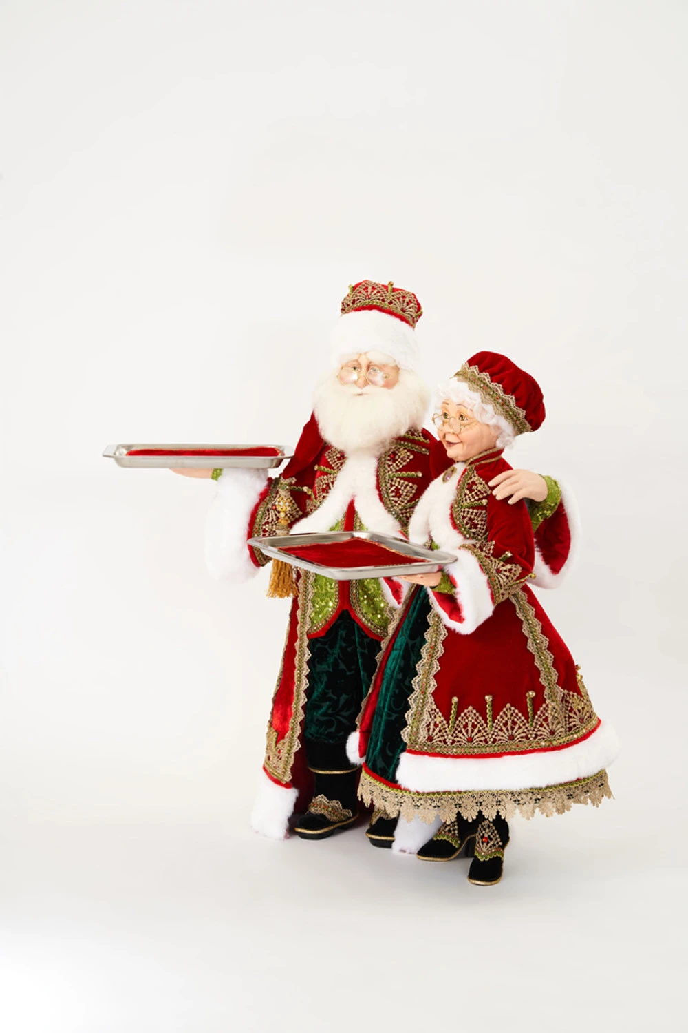 Need a helping hand at the party this year? Santa and Mrs. Claus are dressed in their best red and green velvet robes with golden embroidery and a tray in each of their hands! Serve up your hors d’oeuvres, cookies, or cupcakes! Made by Katherine’s Collection. Made of paper mache, resin, and fabric. Dimensions: 28 × 18 × 32 in. Item #: 28-228582