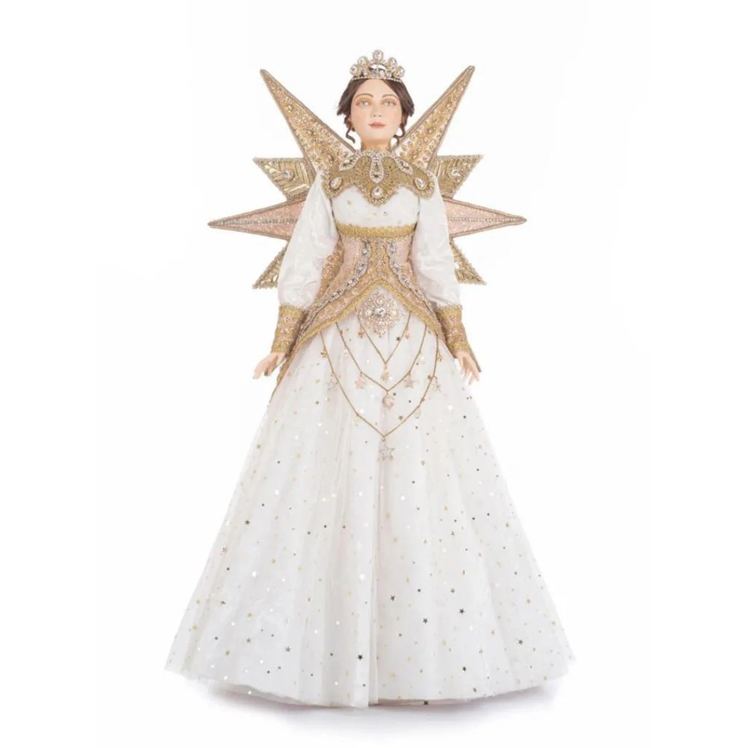 This stunning angel has beautiful brown hair with a stunning golden crown. The dress she wears is encrusted with gold bead and jewel detailing around her neckline, her waist is cinched in with gold fabric and gold embroidered bodice decorated with jewels! Hanging from below the bodice is a few rows of chain with gold star charms dangling from. Her dress is a white tulle with teeny tiny gold star glitter shining brightly! Behind her a large star is covered in stunning bead work, glitter and jewels! Made by Katherine’s Collection. Made of resin, paper mache, and fabric. Dimensions: 17.5 × 17.5 × 32 in. Item #: 28-328828