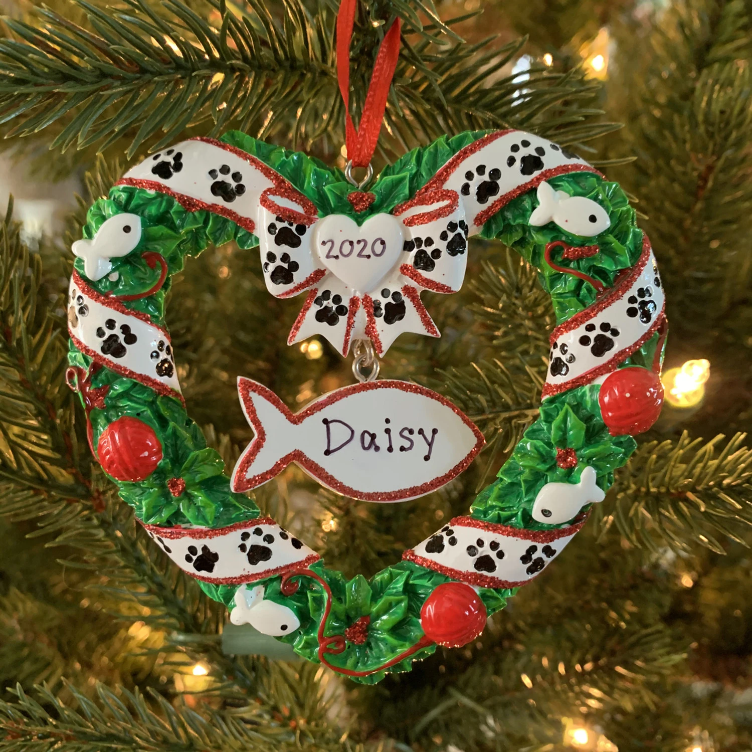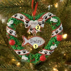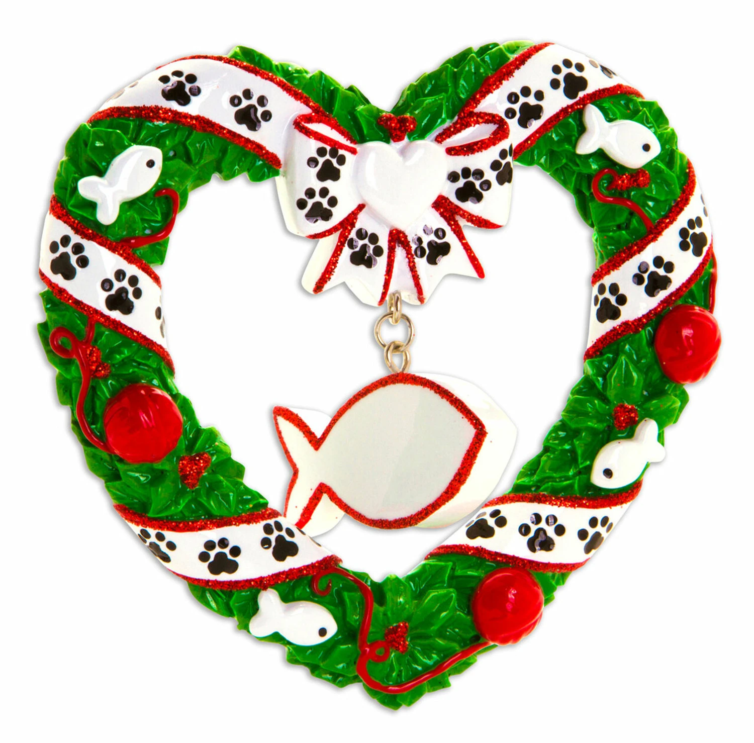 Your sweet kitty cat deserves their own ornament on the tree this year! This ornament features a heart shaped holly wreath decorated with red ball ornaments and tiny fishies, wrapped with a white ribbon! In the center dangles a fish to write your cat’s name on! Made of resin. Dimensions: 4″ x 3.75″ x .5″. Item #: OR1613