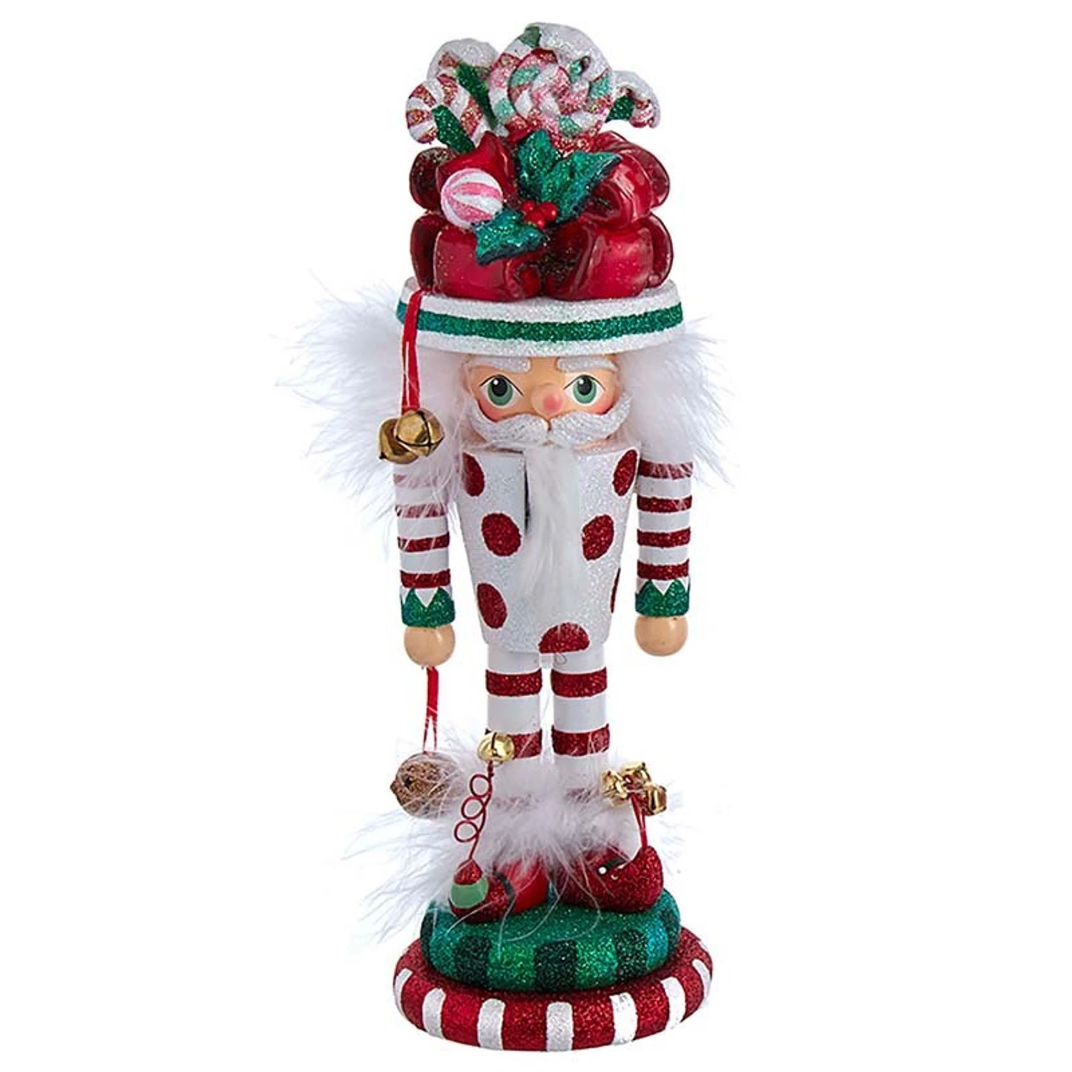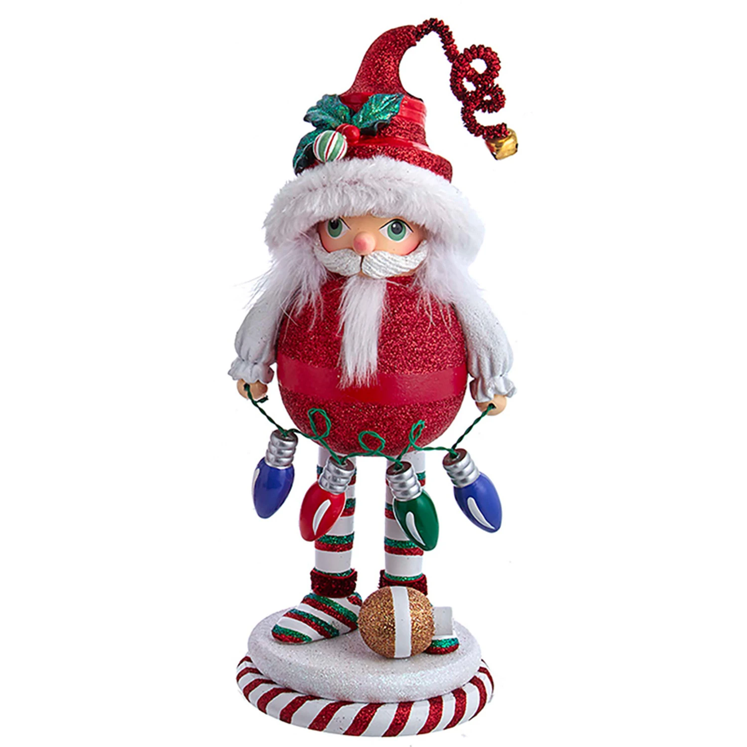 These little cuties are bursting with festive vibes! Each one has curly elf shoes, feather accents, and striped leggings standing on top of glittered pedestals! Choose the present nutcracker that is topped with a large red bow decorated with candy, the tree nutcracker whose body is the base of the tree and the top of the tree towers over his head dotted with gold stars, or the ornament ball body nutcracker holding a string of lights and a funky hat! Each sold individually. Made by Kurt Adler. Made of wood. Dimensions: 5″ x 5″ x 12″. Item #: HA0565