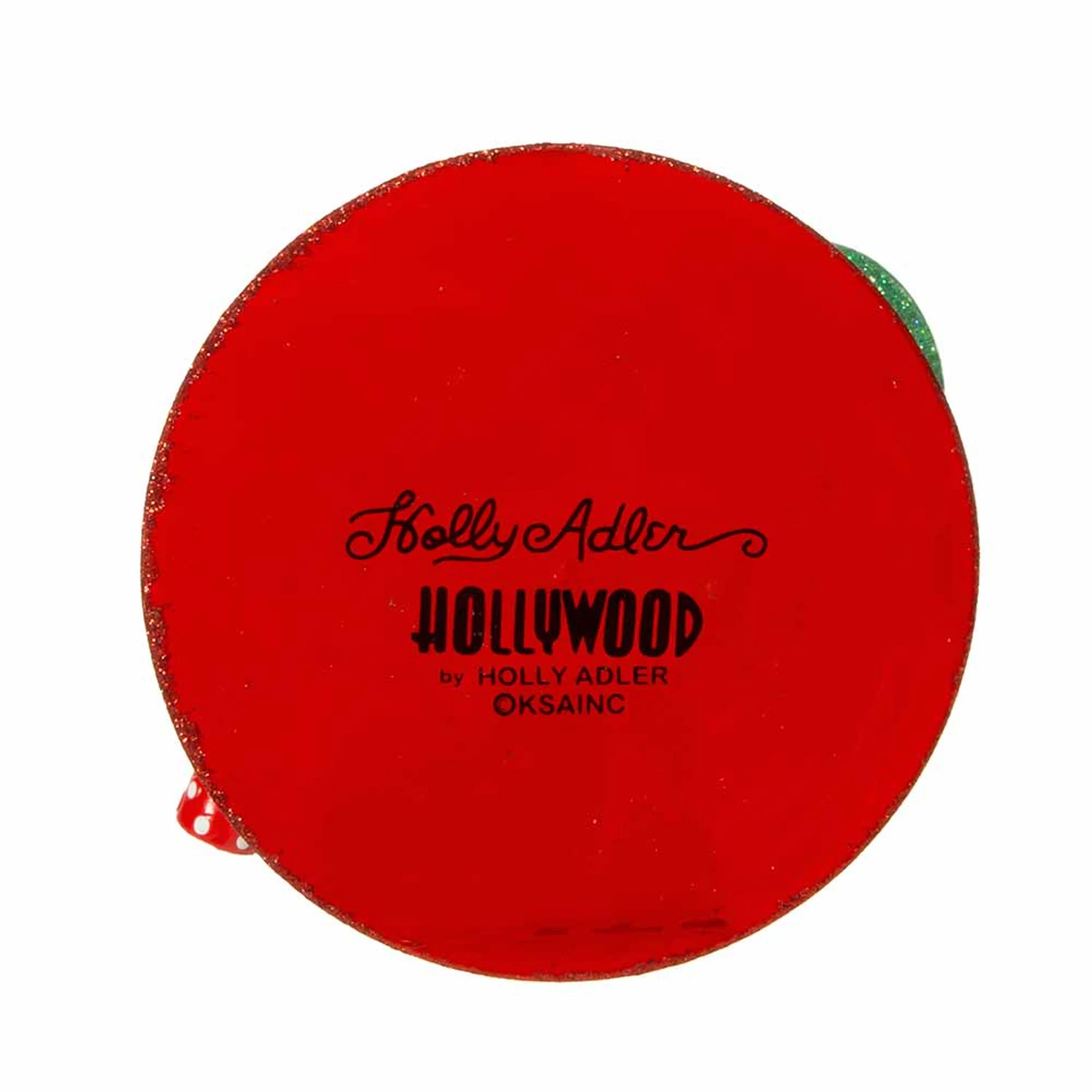 Yum! Yum! This adorable nutcracker features a cute as can be gingerbread man with a white glittered mustache wearing a green long sleeve shirt and green and red glitter striped pants with matching suspenders, the pants are dotted with teeny tiny gingerbread men! His arms and legs have a sweet icing swirl and he wears a pair of glittered shoes! In one hand he holds a slice of cake and in the other is a tiny gingerbread man swinging in a little red cup! On top of the gingerbread man nutcracker sits a scrumptious looking cake with a missing piece revealing the bright red stripe on the inside, the cake is dripping with rich chocolate icing and topped with juicy cherries! Made by Kurt Adler. Made of wood. Dimensions: 15″ tall. Item #: KA0604