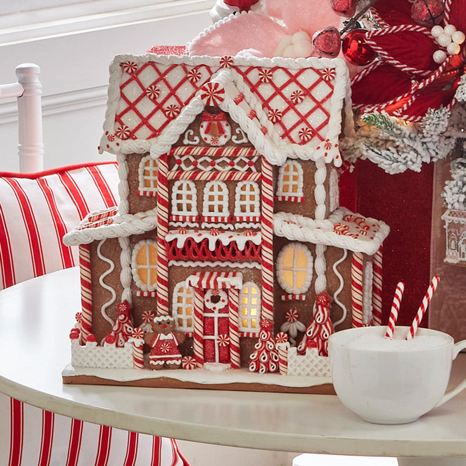 This house looks scrumptious! It features brown cookies walls and a white icing roof with different textures and peppermint candies! The windows are trimmed in white icing with peppermint stick trim and a wreath hanging at the top of the house! Outside of the front door stands a small gingerbread man and a few red and white ribbon trees! Requires 3 AA Batteries, 6 Hour Timer Repeats Every 18 Hours. Made by Raz Imports. Made of clay dough. Dimensions: 13″ L X 7″ W X 13″ H. Item #: 4316276