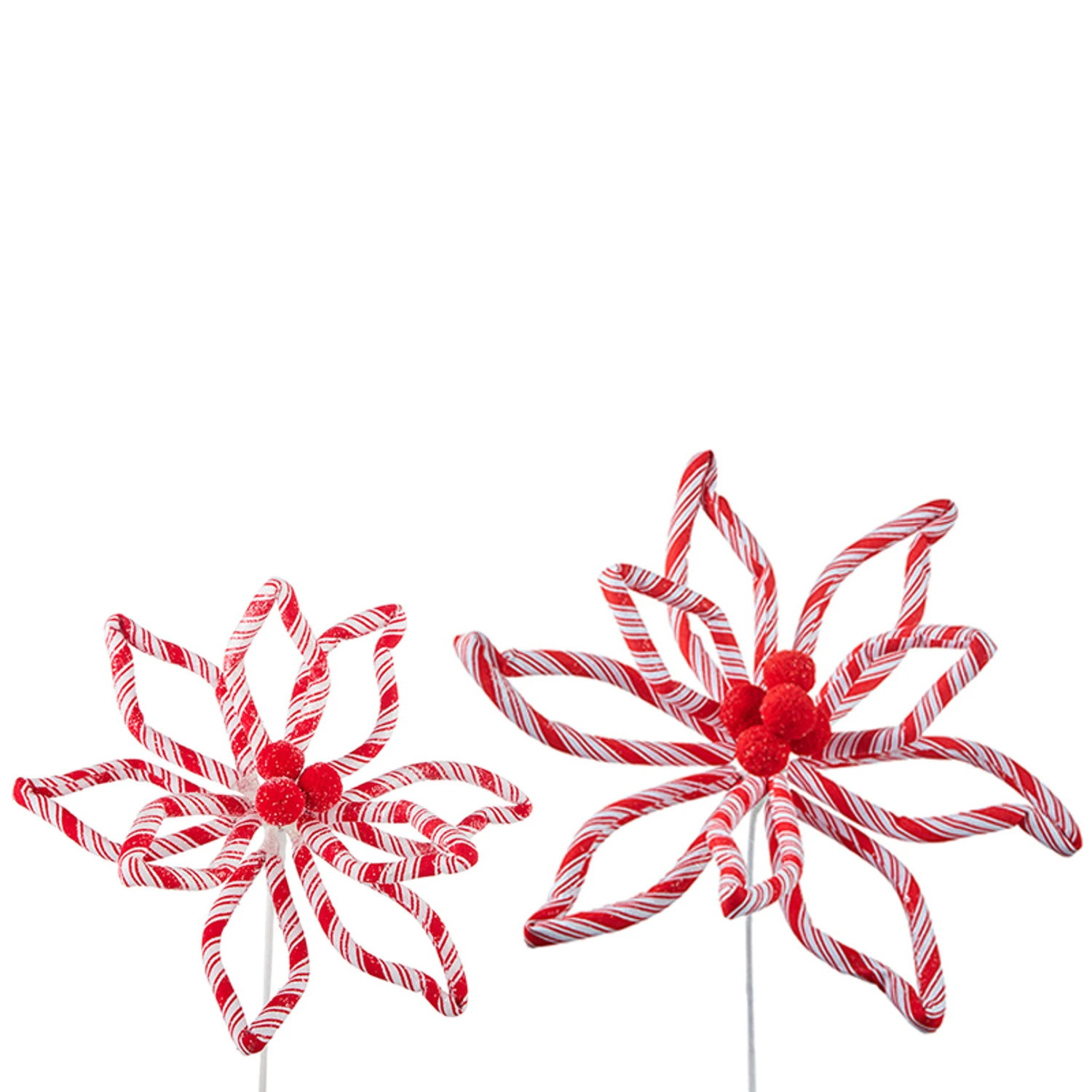 This gorgeous poinsettia! Each leaf is made of a peppermint striped candy and the center has red pom-pom balls covered in glitter! Made by Raz Imports. Made of polyester. Dimensions: 16.5″ or 24.5″. Item #: F4206712 or F4206721