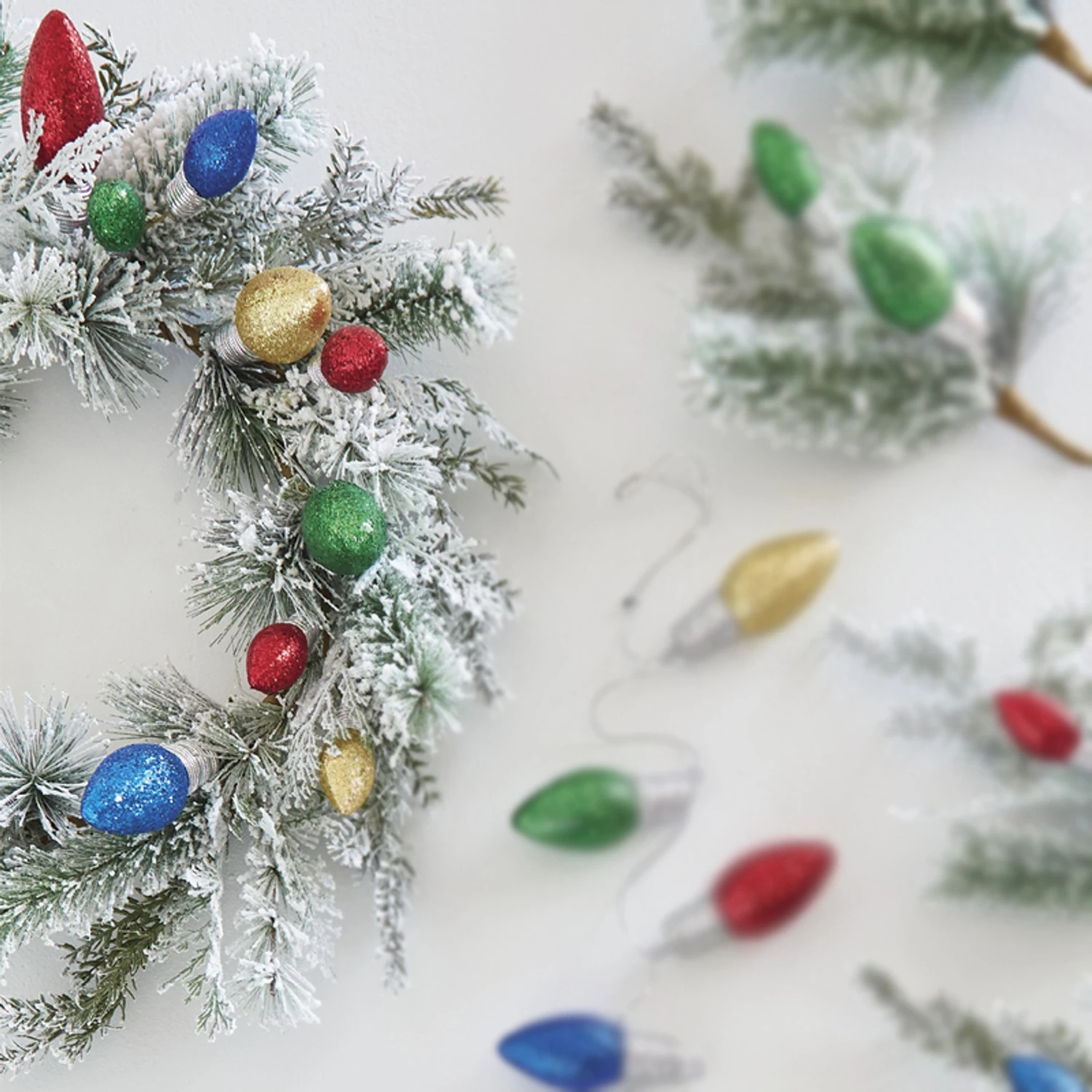 We love a good flocked wreath! This one features fluffy green branches with a coating of white flocked snow with red, blue, green, and gold glittered c7 lights bulbs placed throughout! Made by Raz Imports. Made of plastic and foam. Dimensions: 22″. Item #: W4206875