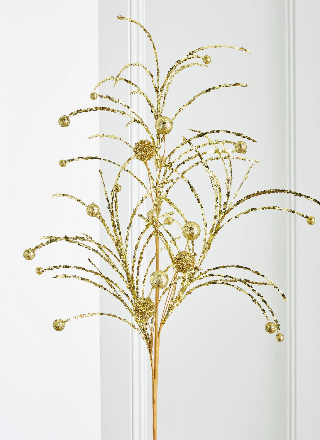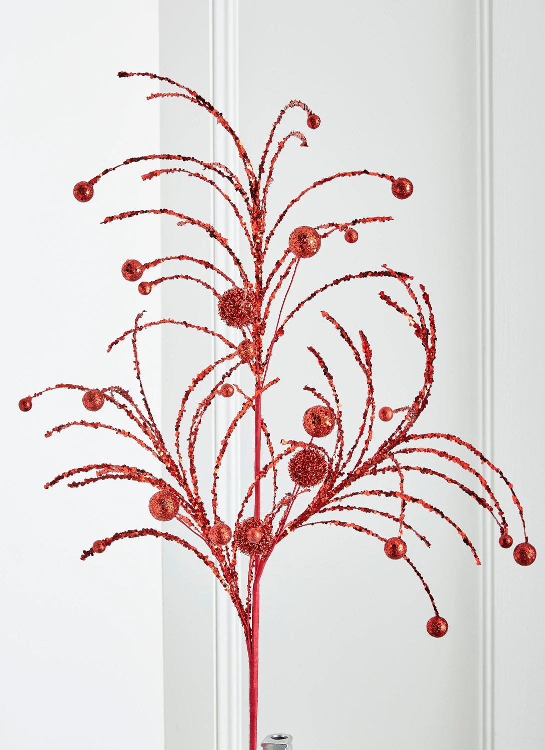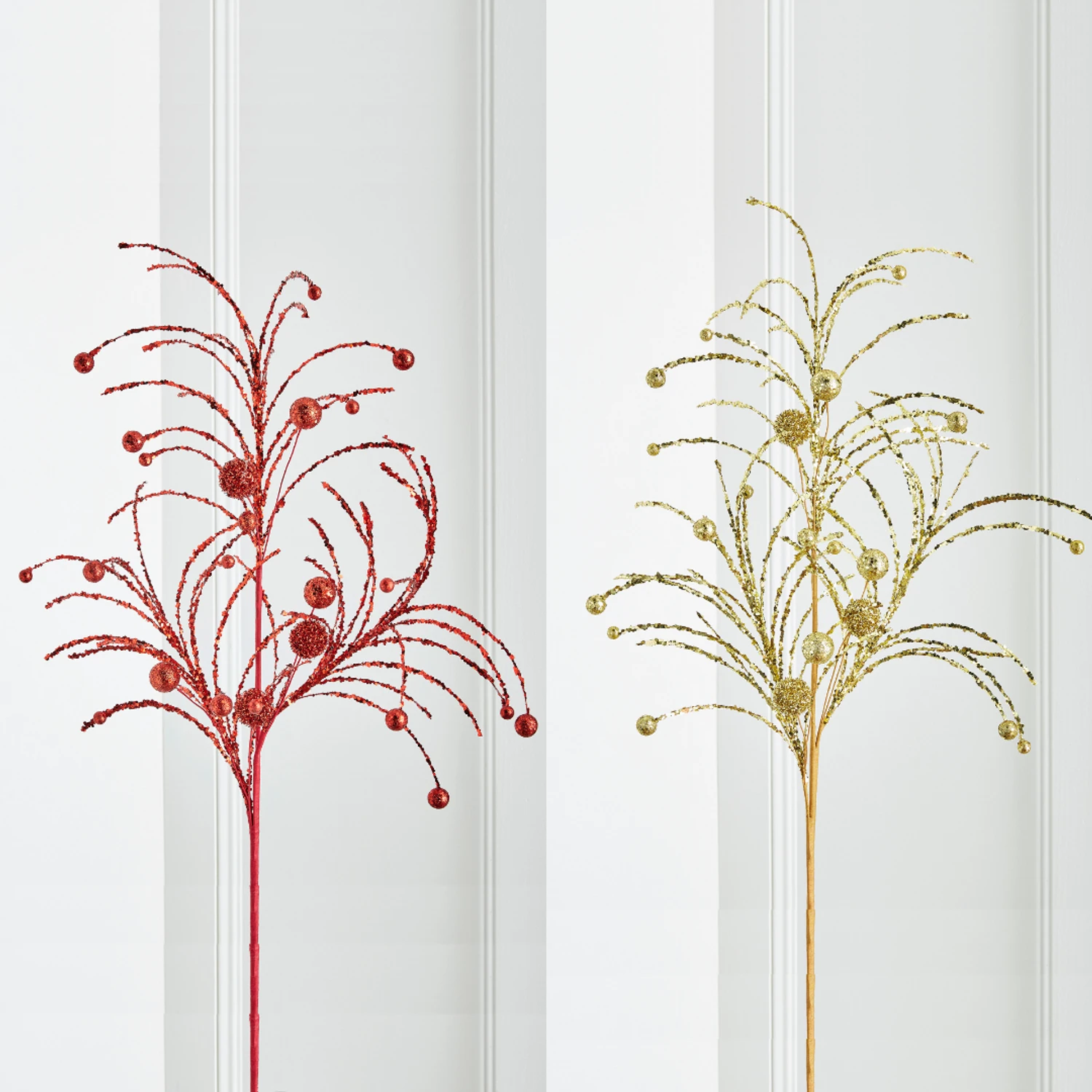 You can never have too much glitter during the holidays! Choose between a red of gold glitter spray that looks like a fireworks with flowing branches and ball ornaments covered in sparkling glitter! Each sold individually. Made by Raz Imports. Made of plastic and foam. Dimensions: 42″. Item #: F4302501 or F4302503