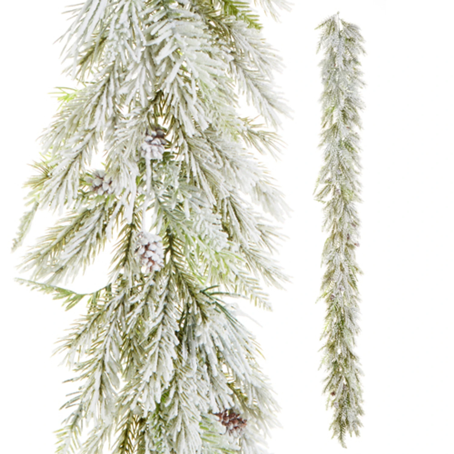 Decorate your mantle with this pretty green garland dusted with thick white snowfall and tiny pinecones dotted throughout! Made by Raz Imports. Made of plastic. Dimensions: 6′. Item #: G4310311