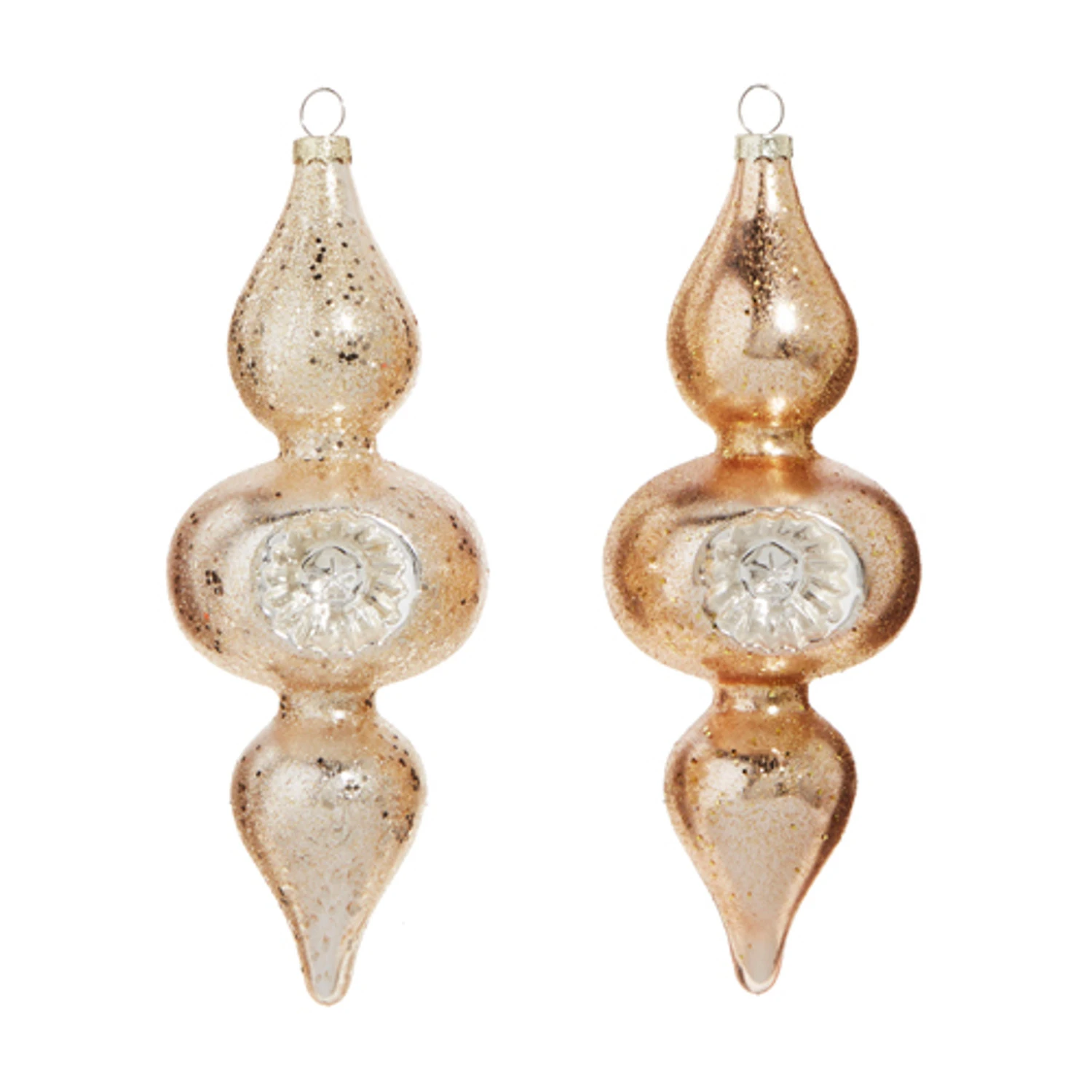 Silver and gold! Silver and gold! Decorate your Christmas tree, wreath, or garlands with a few of these stunning ornaments! Each one is a lovely shade of gold dusted with gold flecks of glitter with a silver reflector in the center! Each sold individually OR as a set of 2. Made by Raz Imports. Dimensions: 2.5″D X 8″H. Item #: 4324535