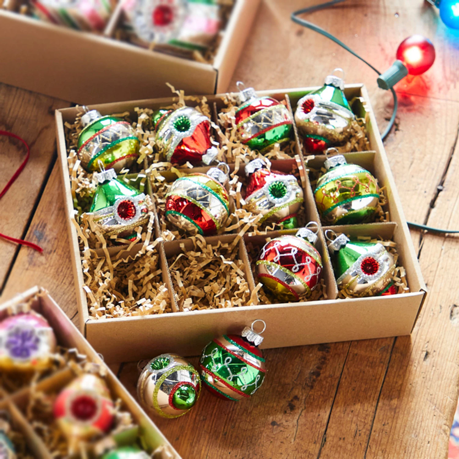 Get a whole box of perfect ornaments to decorate your Christmas tree, wreath, or garland with this holiday season! Each vintage inspired ornament is a two toned red and green with sparkling glitter and small reflectors in the center! Sold as a box of 12. Made by Raz Imports. Made of glass. Dimensions: each ornament is 3.25″. Item #: 4320850