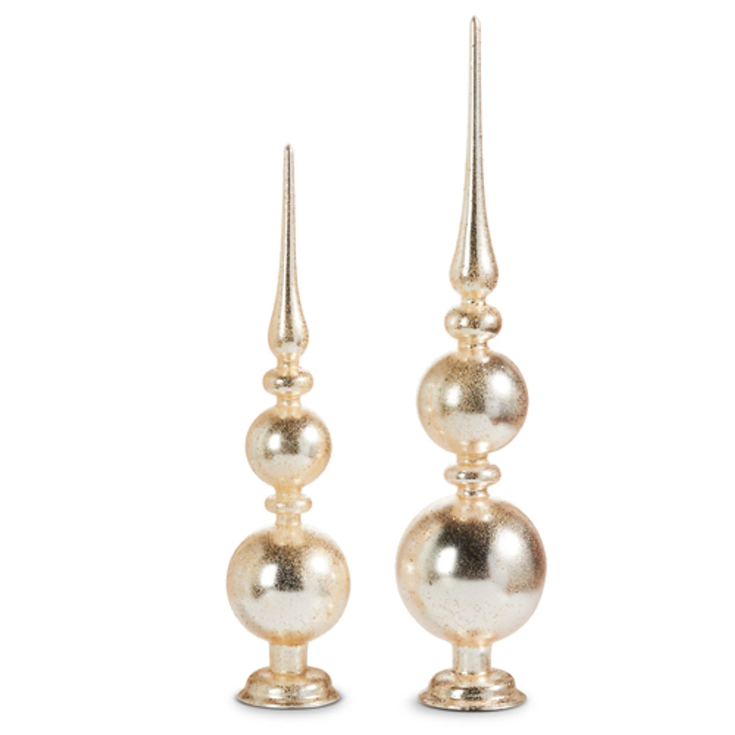 Make your mantle a statement piece this holiday with this stunning set! It features a pair of golden standing finials with a metallic finish and a unique texture coating! Sold as a set of 2. Made by Raz Imports. Made of glass. Dimensions: 5″D X 22″H; 4″D X 18″H. Item #: 4324555