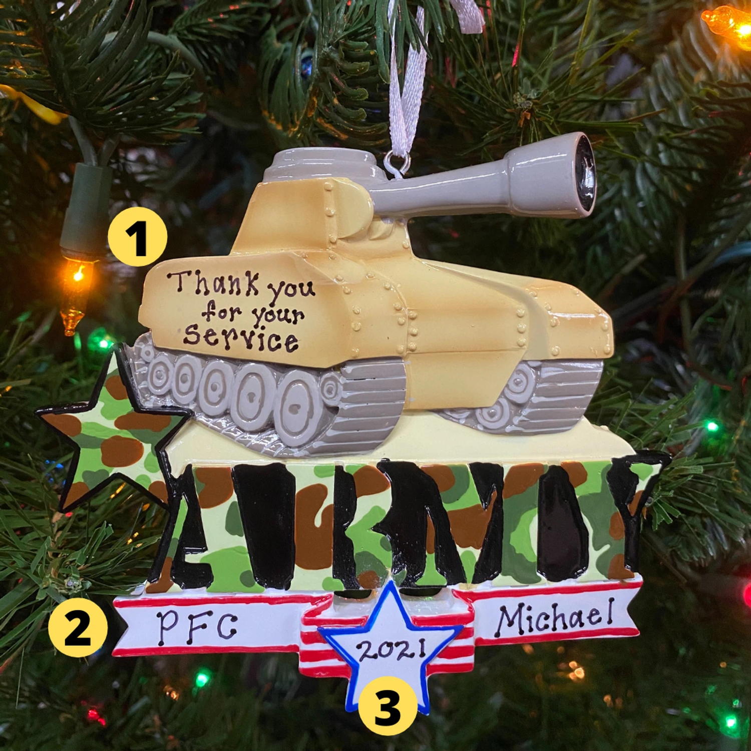 Celebrate your military family and friends with this awesome Christmas ornament! It features a tan tank with a patriotic banner and star! Perfect to get their name and the year! Made of resin. Dimensions: 4.5″ x 4.25″. Item #: OR1397